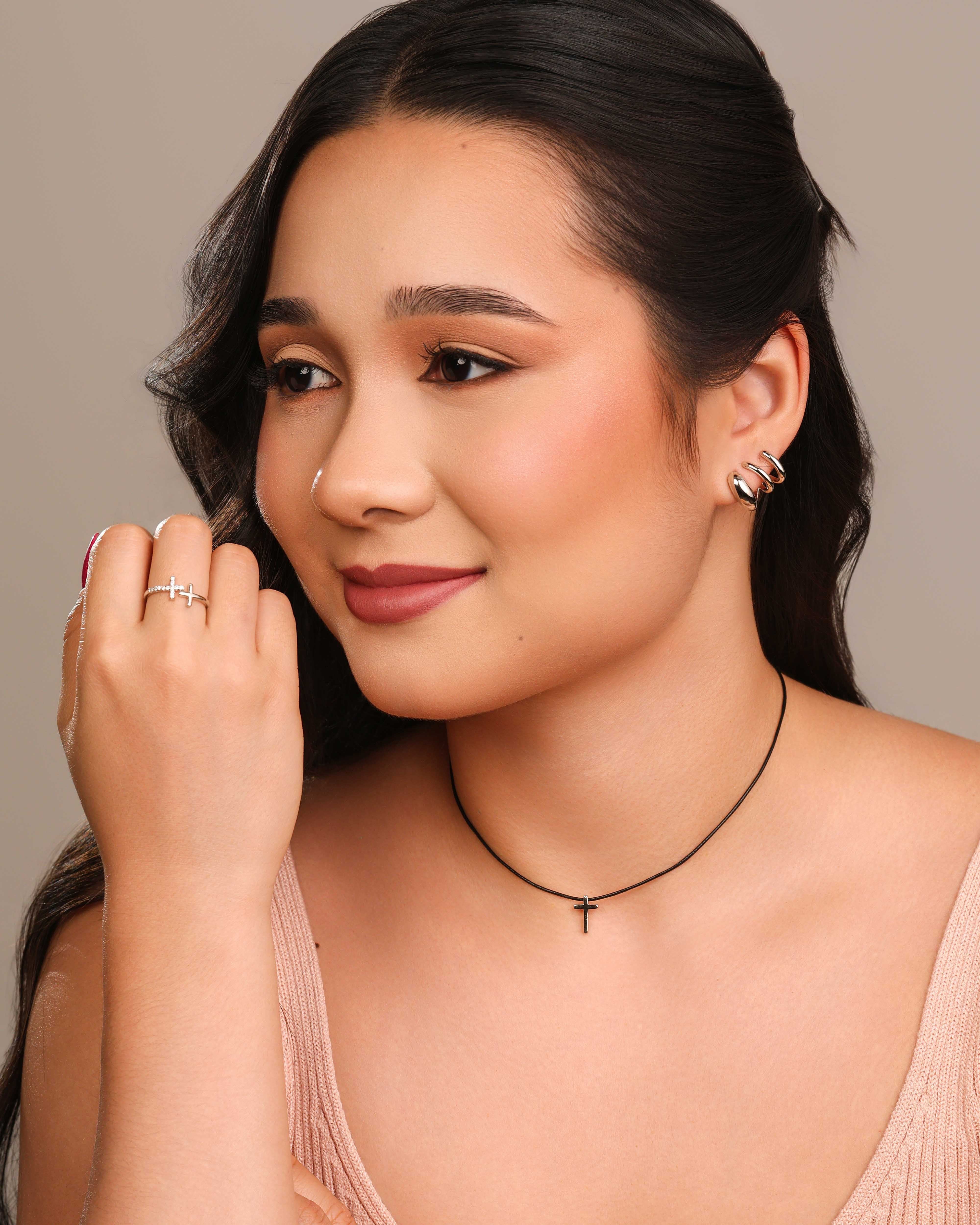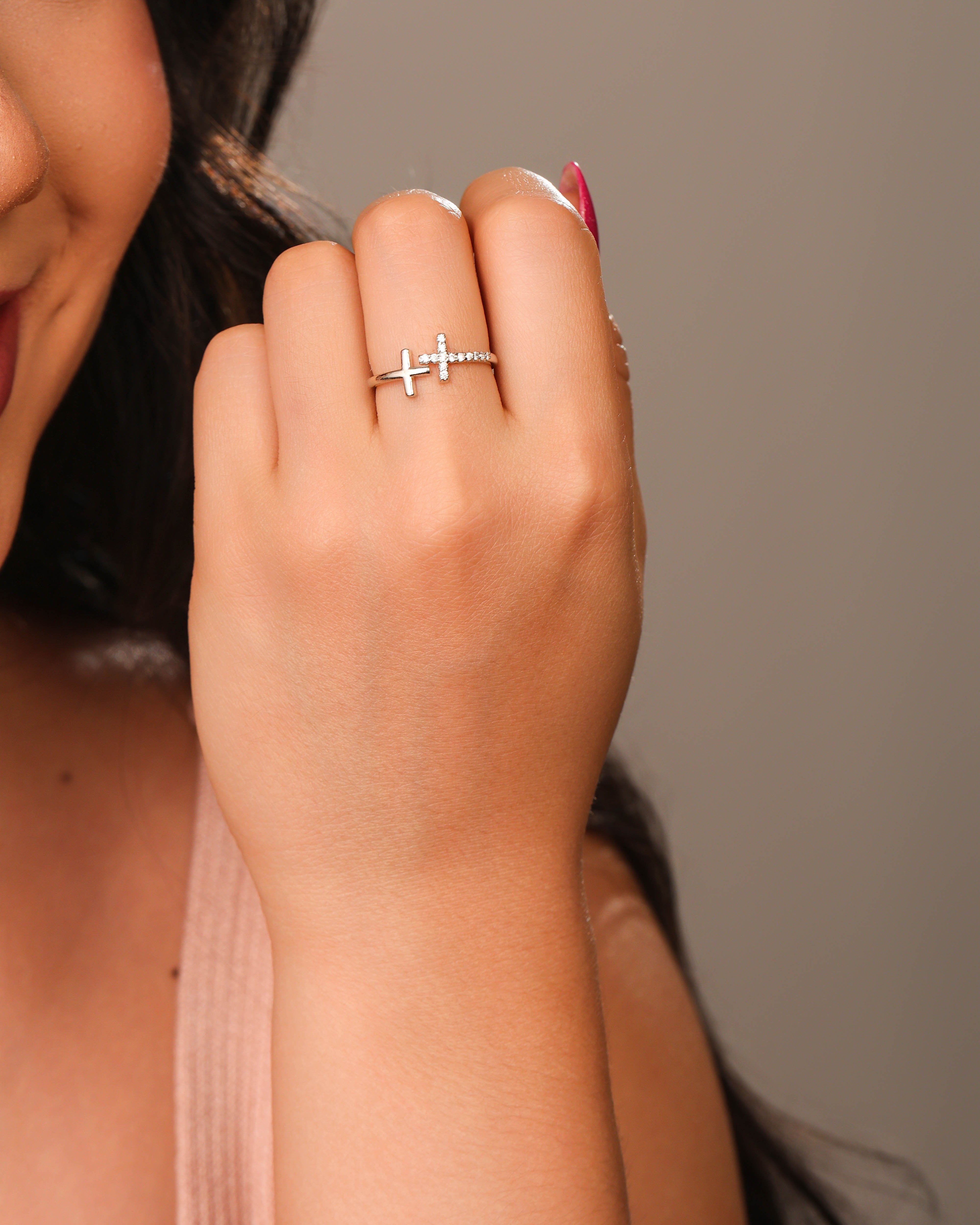 Anel Ajustável Cruz Cravejada e Lisa Tamanho P Ródio Branco