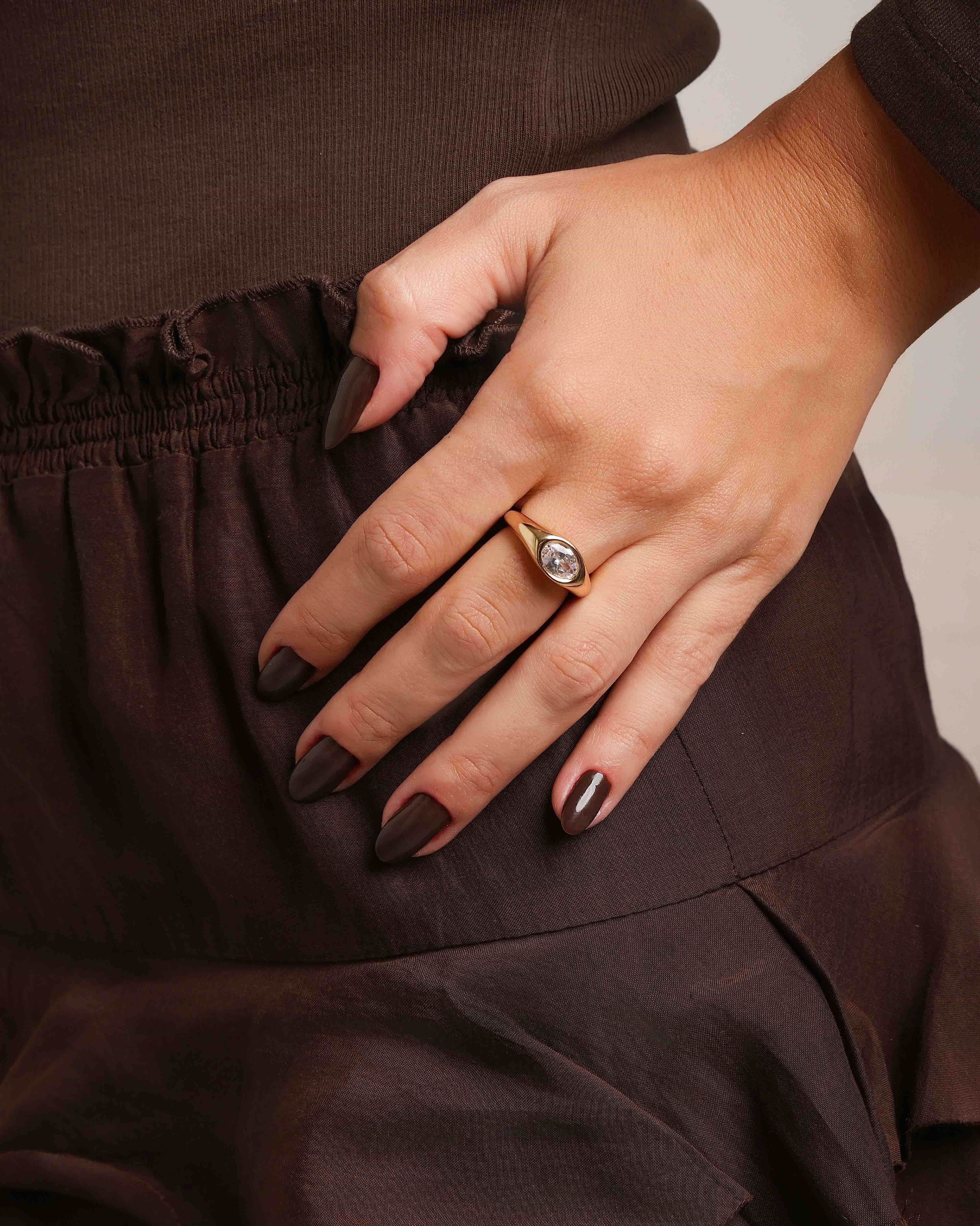 O Anel Zircônia Oval banhado a ouro 18K tem um visual elegante e feminino, com a pedra central em formato oval trazendo um brilho equilibrado que valoriza a mão com naturalidade. O aro liso destaca o cristal de forma sofisticada, criando uma peça leve, moderna e perfeita para quem gosta de acessórios que chamam atenção na medida certa.