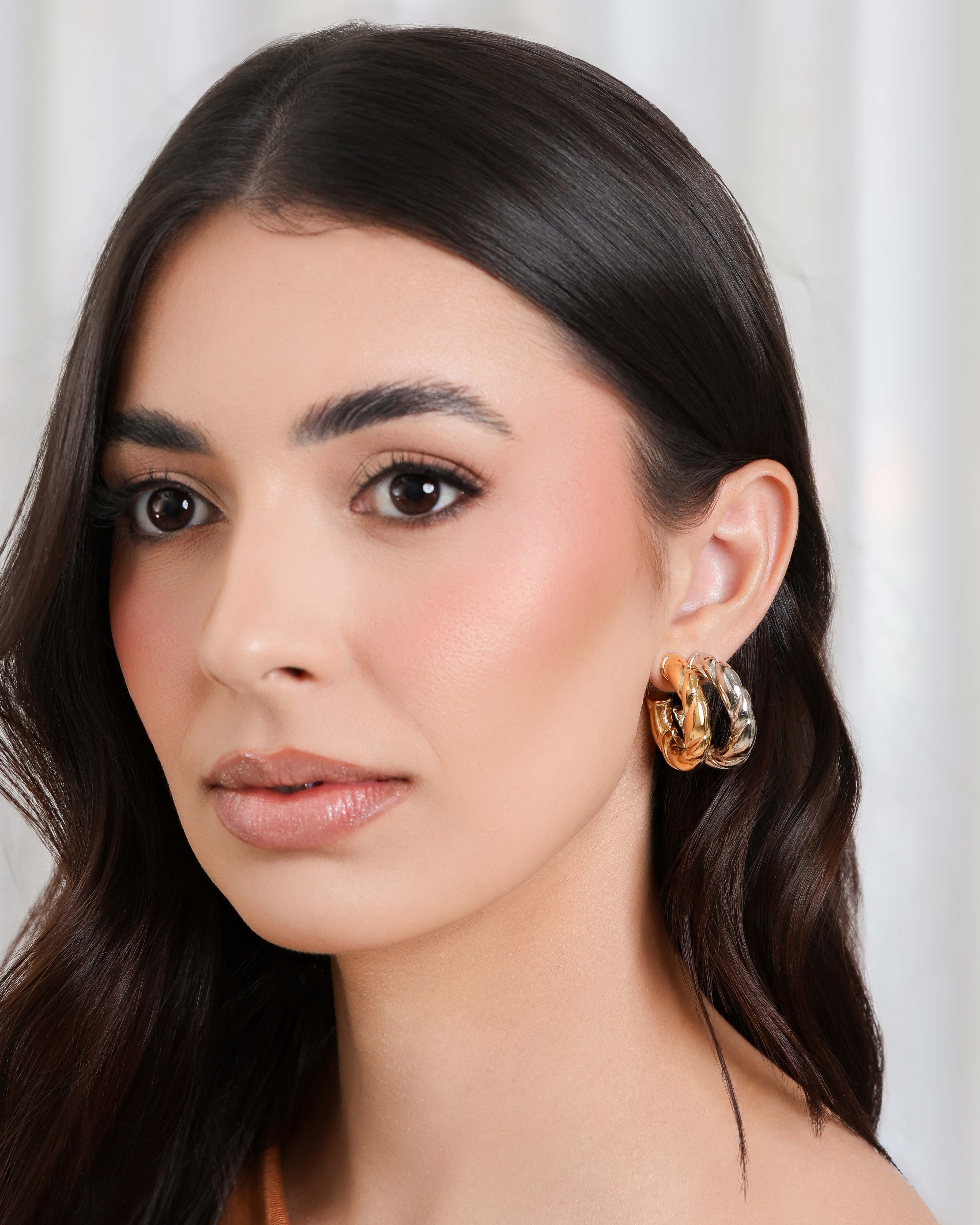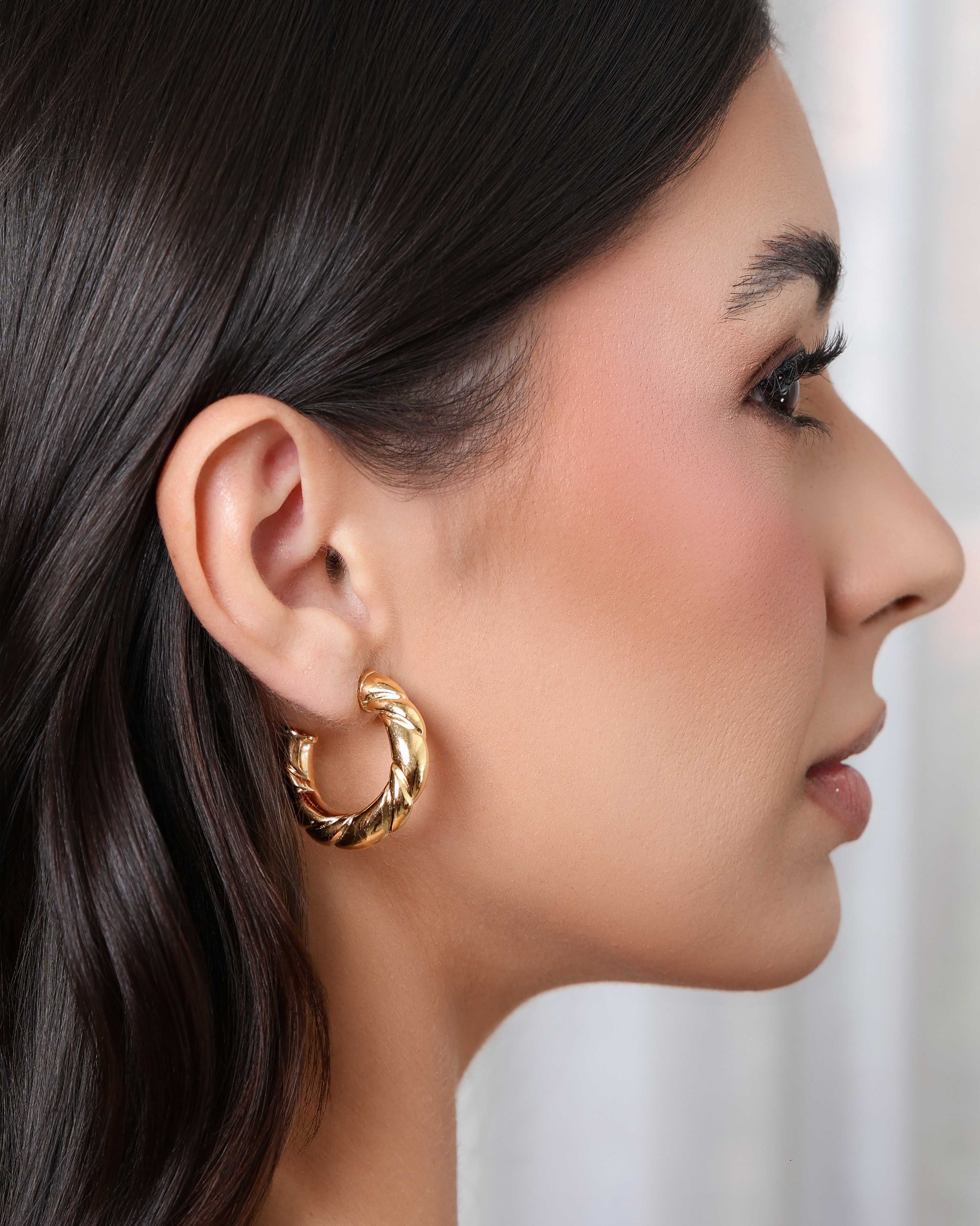 O Brinco Argola Tubo Torcida ABS banhado a ouro 18K tem um visual moderno e elegante, com a torção do tubo criando um efeito leve e sofisticado ao redor da orelha. A peça é volumosa na medida certa, trazendo presença sem pesar e iluminando o rosto com naturalidade. É aquele tipo de argola que transforma o look sem esforço e deixa tudo mais estiloso.