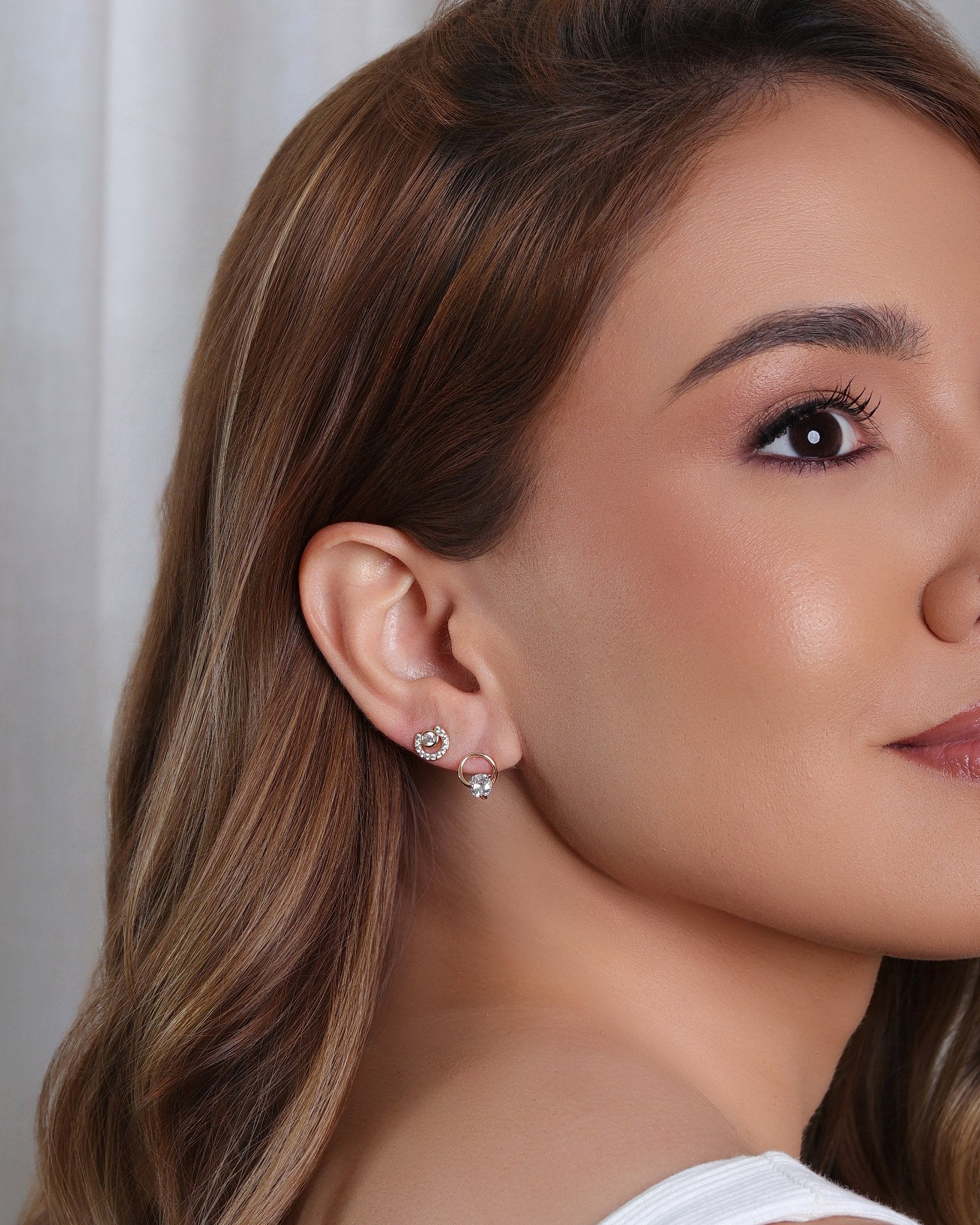 O Brinco Duplo Círculo com Ponto de Luz e Círculo Cravejado Cristal banhado a ouro 18K combina dois formatos que trazem brilho leve e visual sofisticado. O primeiro círculo destaca um ponto de luz cristal em estrutura lisa, enquanto o segundo traz cristais cravejados que criam um contraste elegante. A composição dupla ilumina o rosto sem exagero e oferece aquela estética feminina que funciona muito bem no dia a dia.