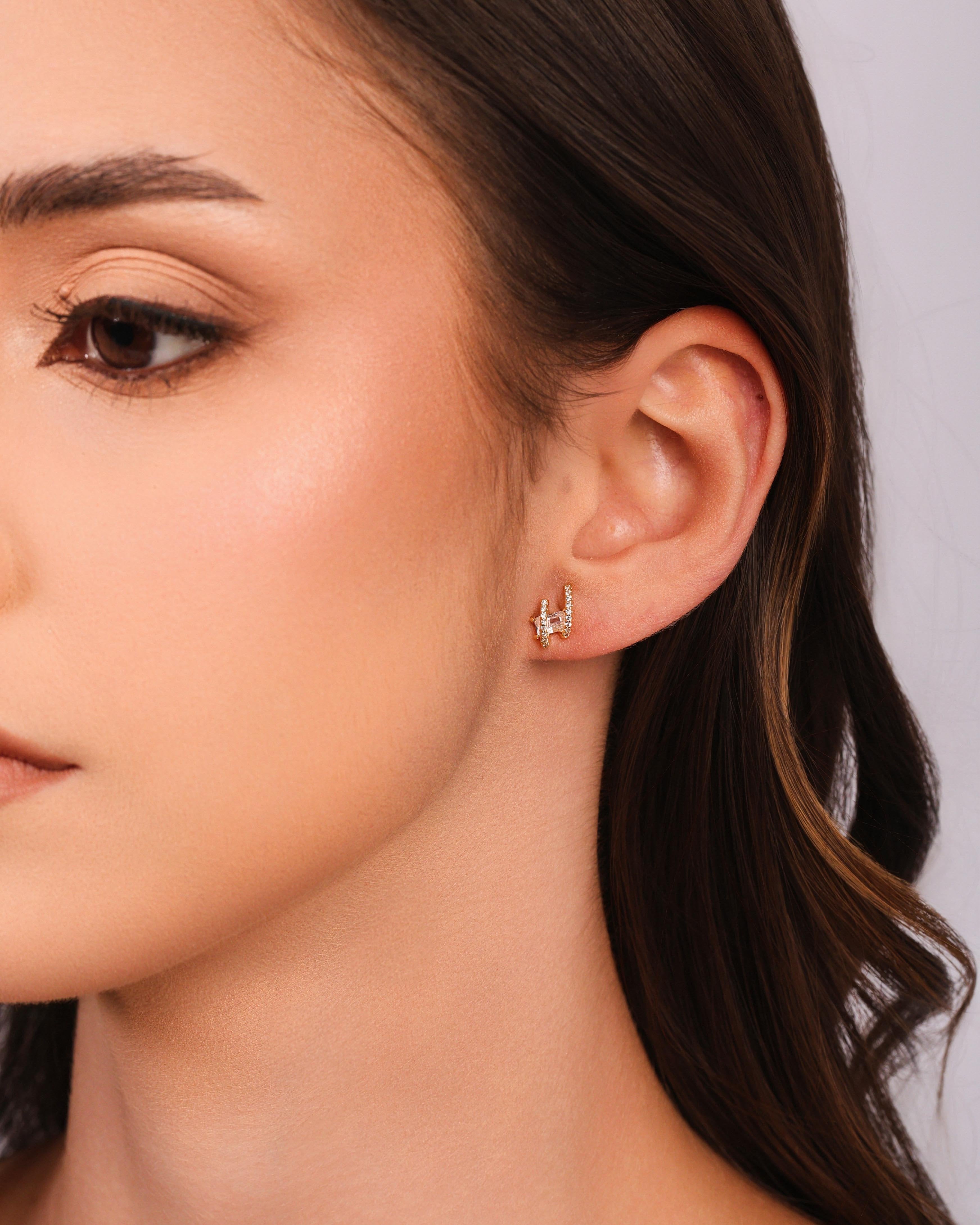 O Brinco Filetes Cravejados Baguete Cristal é perfeito para quem ama delicadeza com um toque de brilho moderno. Os filetes curvos, todos cravejados, trazem luminosidade suave e elegante, enquanto a pedra baguete central adiciona um ponto de destaque que valoriza o visual sem exageros.