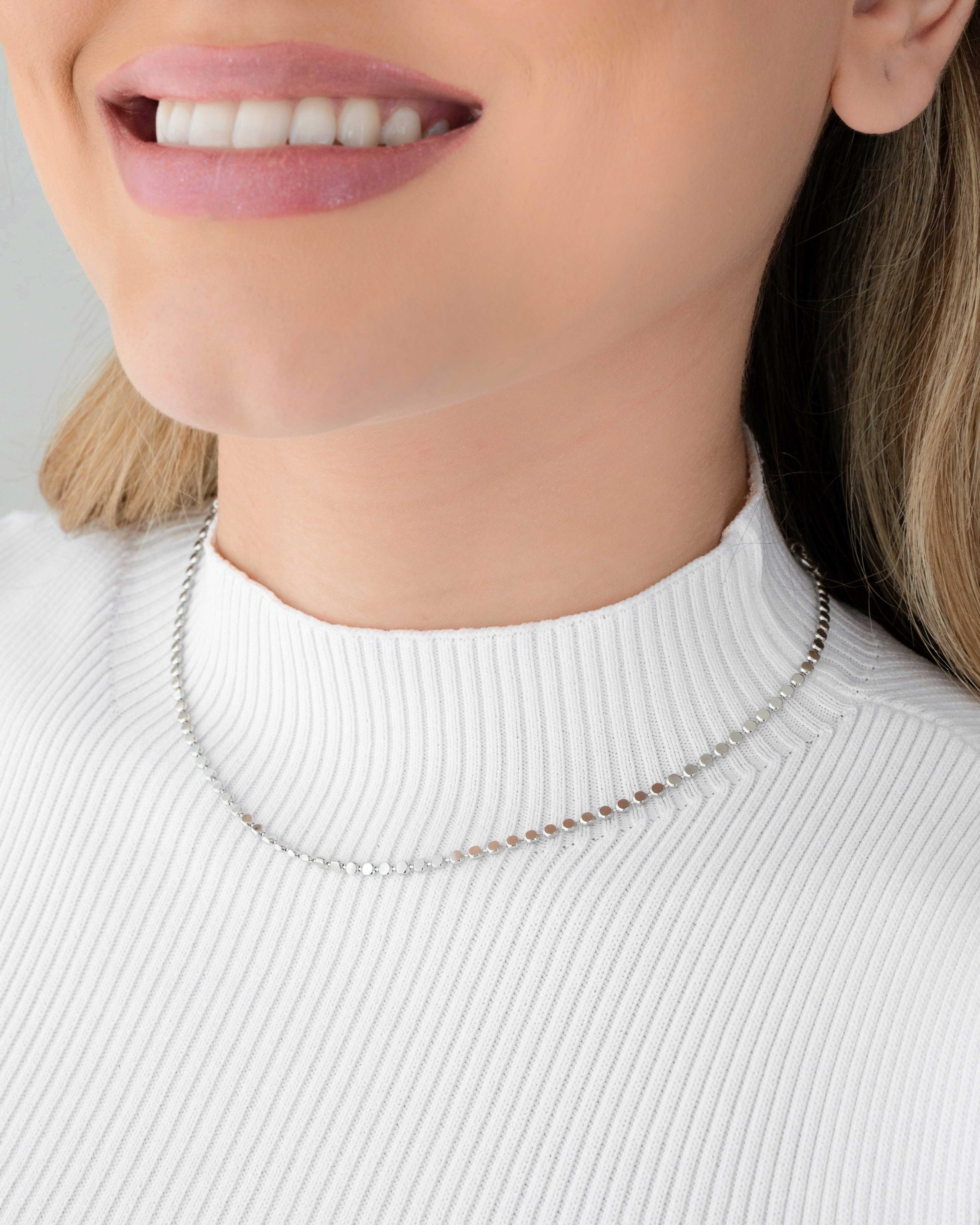 Banho Branco Gargantilha: 31 cm Extensor: 10 cm Espessura: 2.5 mm Semijoias hipoalergênicas de alta qualidade (livre de níquel). Garantimos nossos produtos contra defeitos de fabricação por um prazo de 12 meses a partir da data da compra. Obs.: Medidas e cores apresentadas nas fotos podem sofrer pequenas alterações.