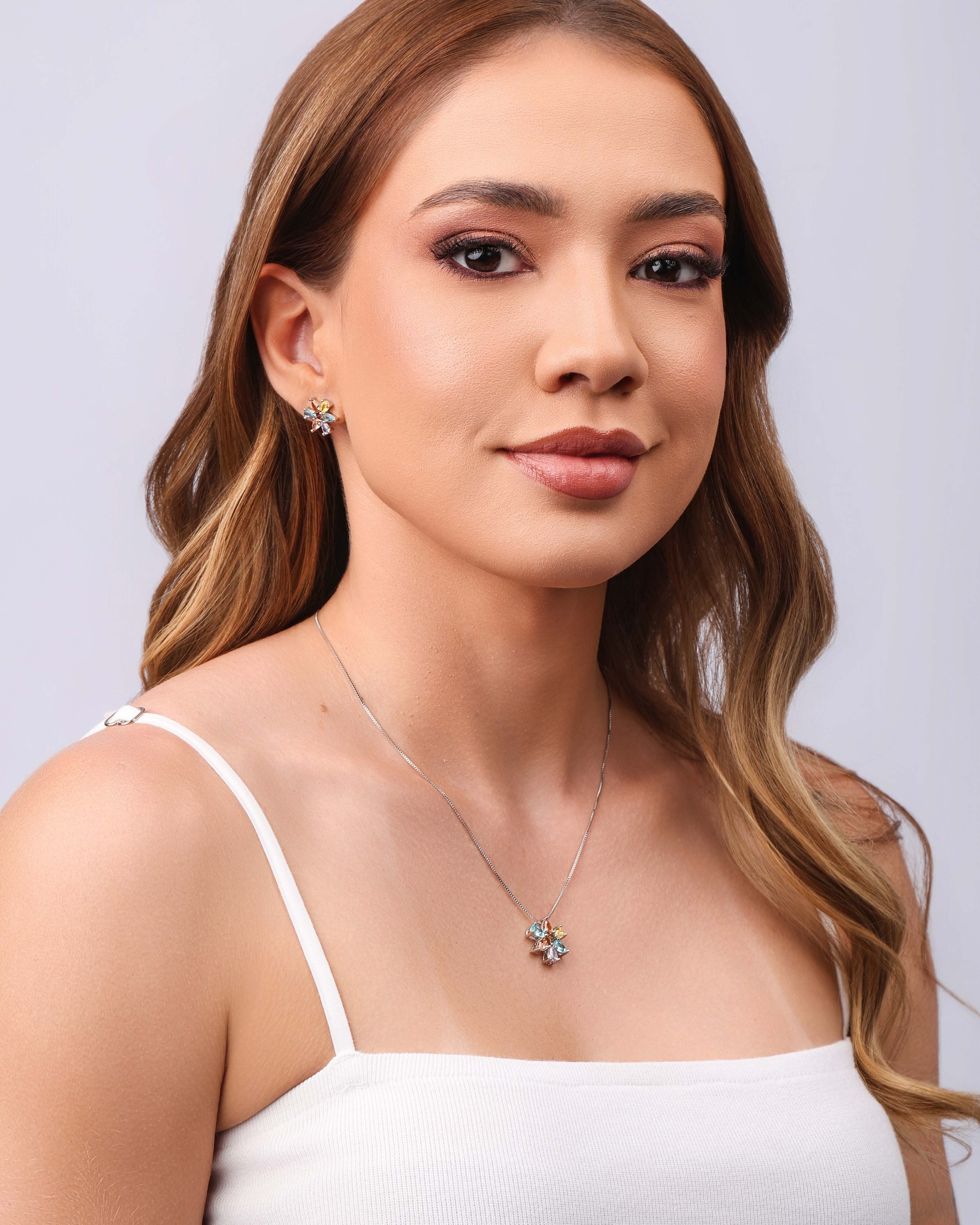 O banho ródio branco oferece durabilidade e conforto, mantendo as peças bonitas mesmo com o uso frequente. É um conjunto versátil, perfeito para quem busca elegância com um toque de cor no dia a dia ou em ocasiões especiais.