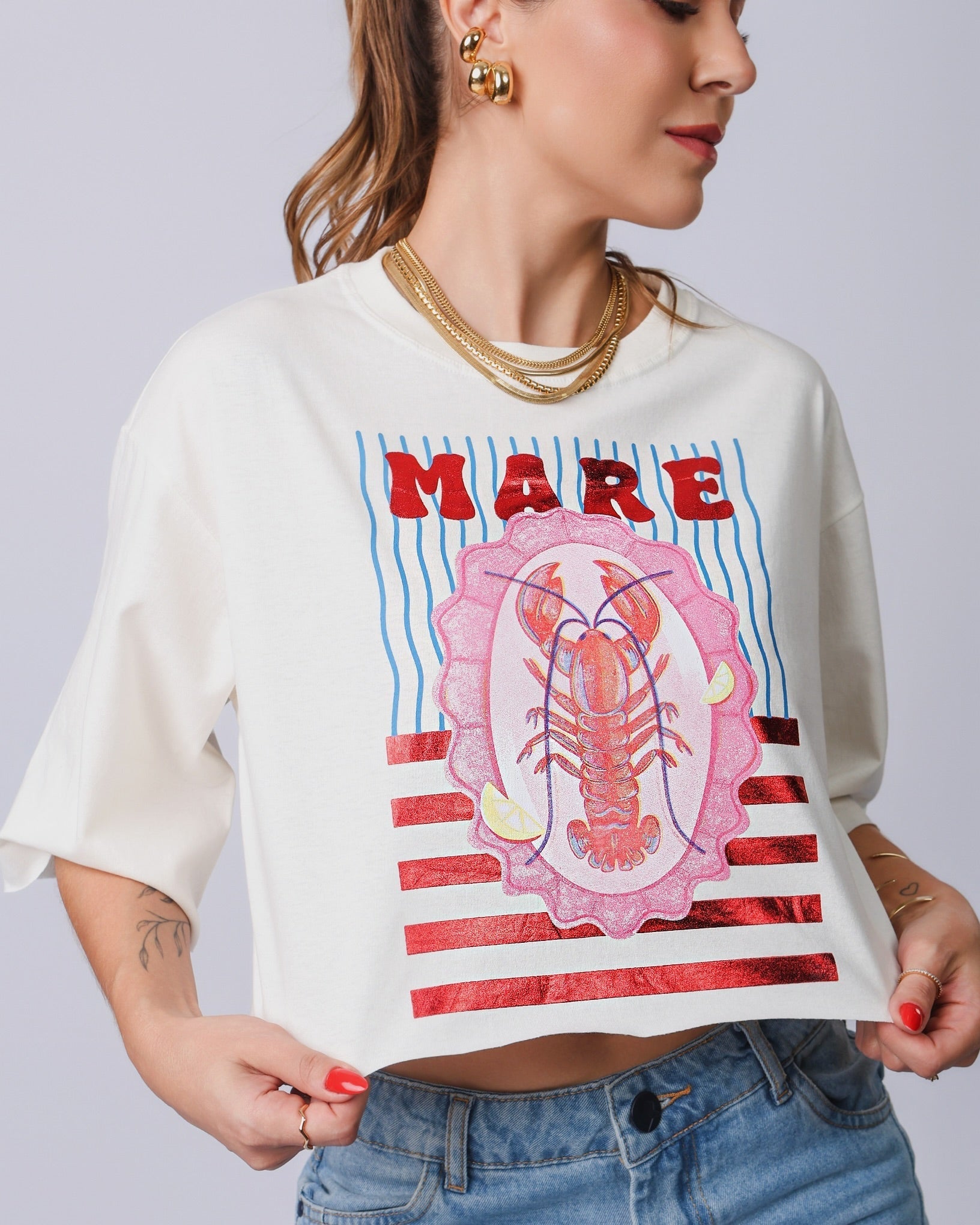 Cropped com estampa metalizada, feito em malha 100% algodão, confortável, macio e com ótimo caimento.