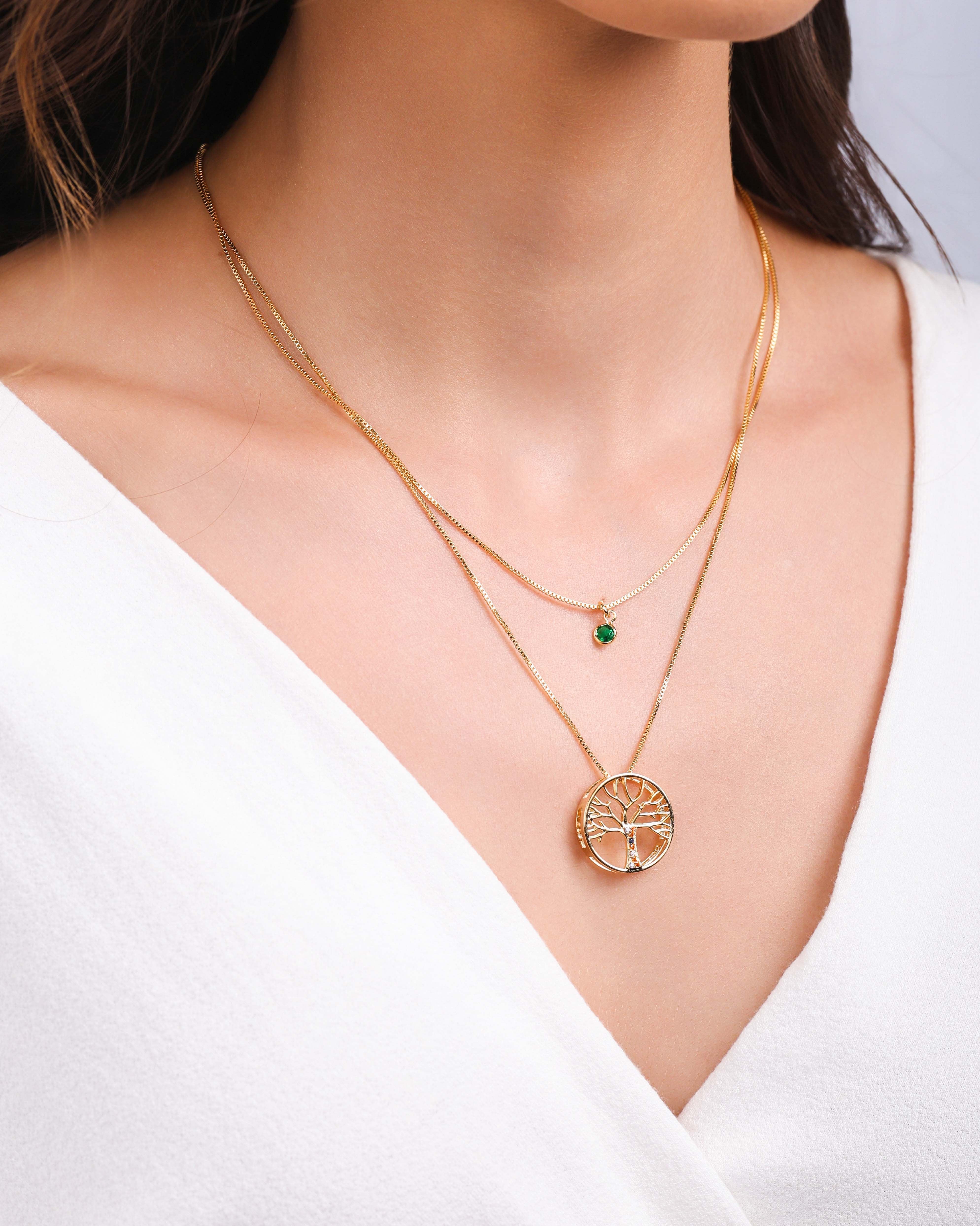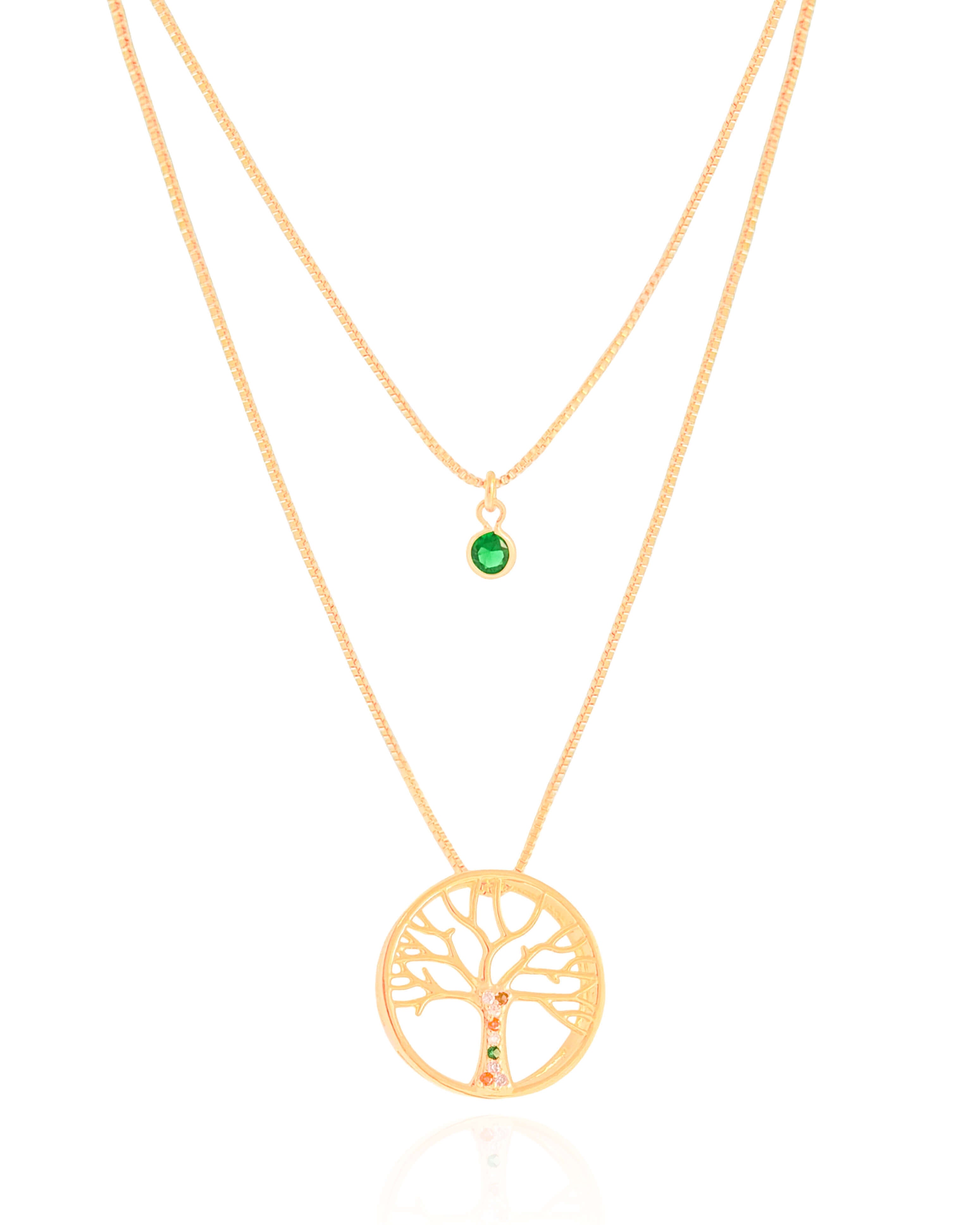 Design: Duas correntes em alturas diferentes, com ponto de luz esmeralda de 4 mm e pingente Árvore da Vida de 19 mm, com recortes vazados e pedras sutis.