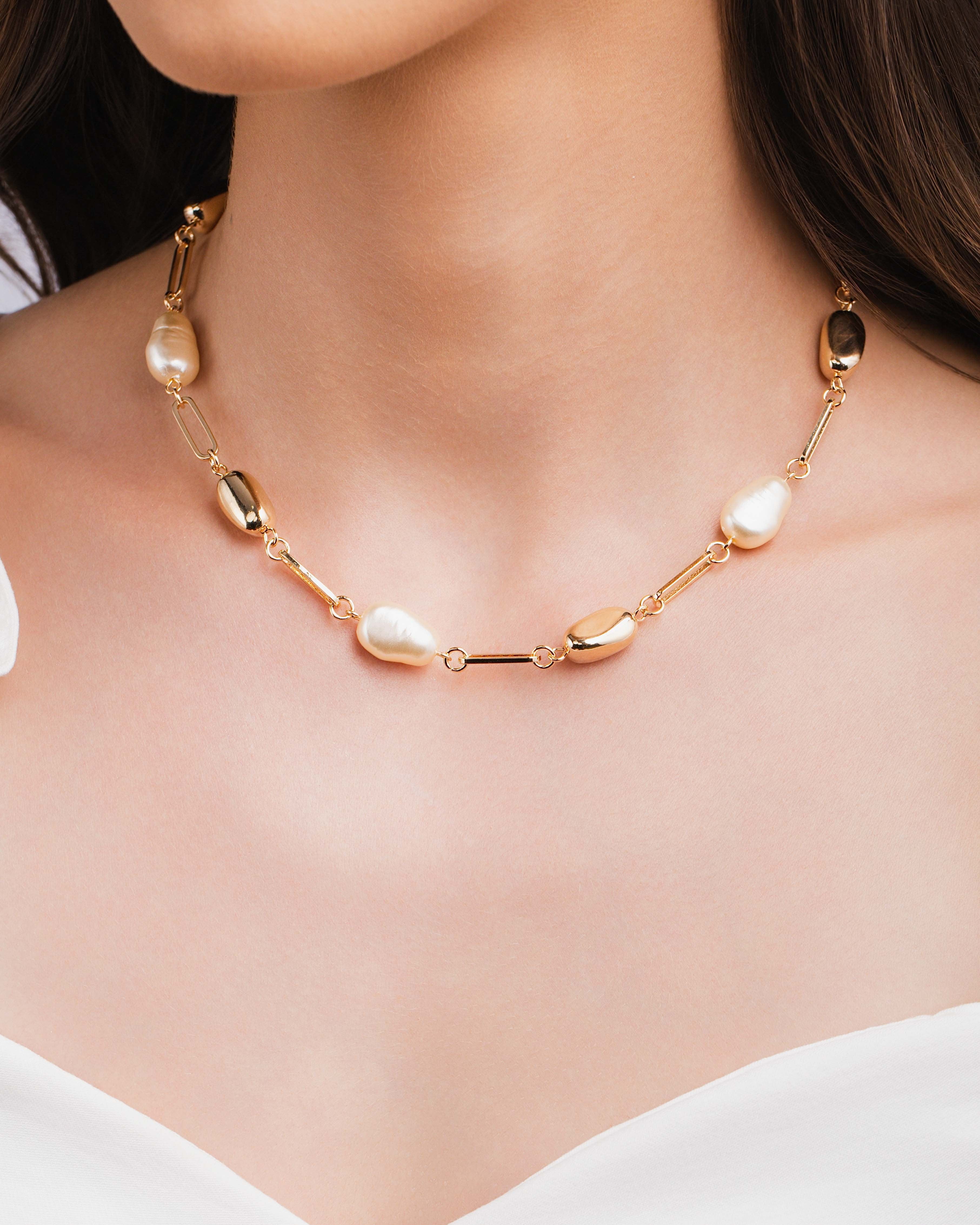 Design: Elos orgânicos intercalados com pérolas barrocas de formato natural, criando um visual moderno e elegante.
