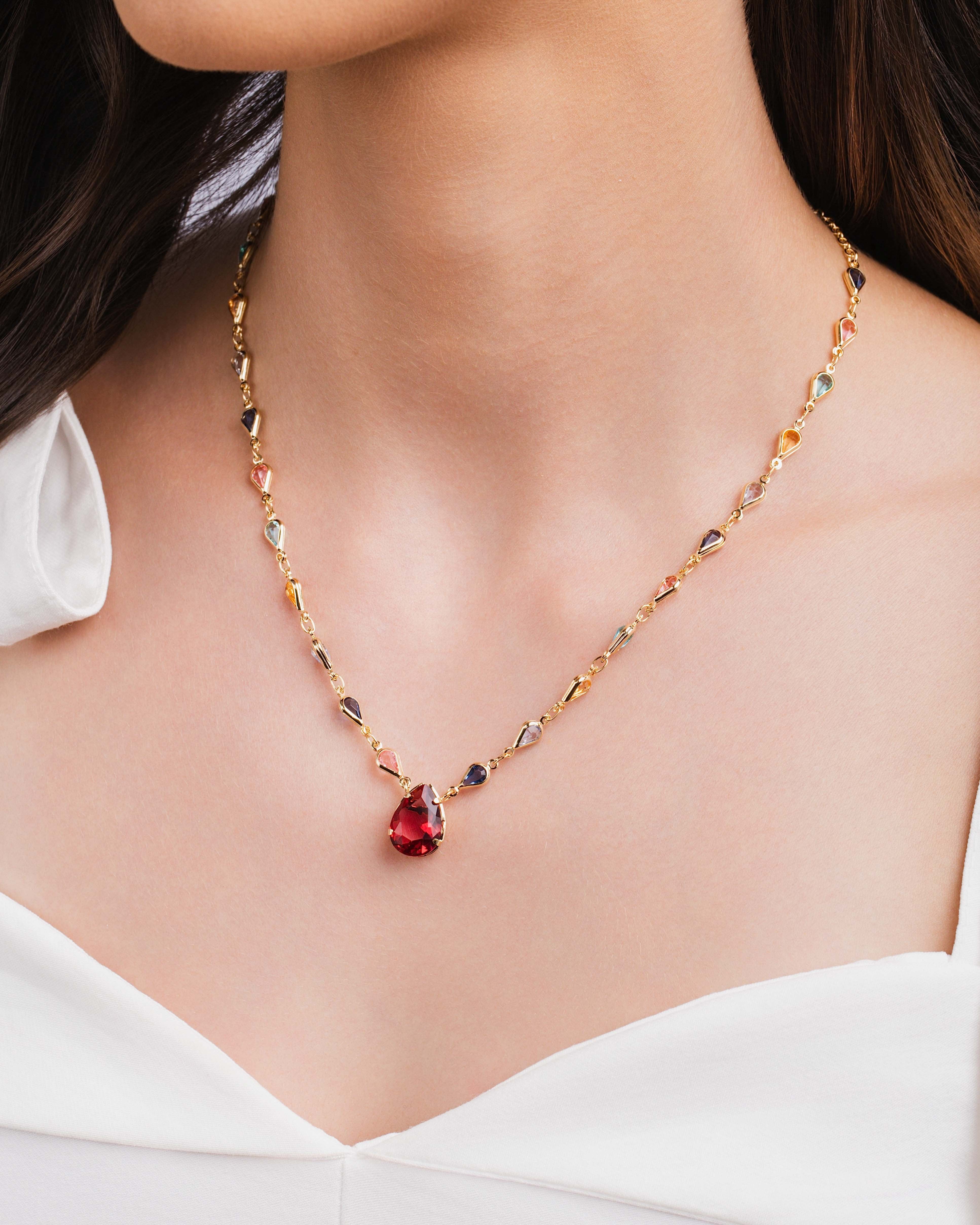 A Gargantilha Gotas Coloridas banhada a ouro 18K traz leveza e cor em um design delicado e elegante. As pequenas gotas coloridas distribuídas ao longo da corrente criam um visual alegre e equilibrado, enquanto o pingente em formato de gota adiciona um ponto de destaque suave que valoriza o colo com naturalidade.