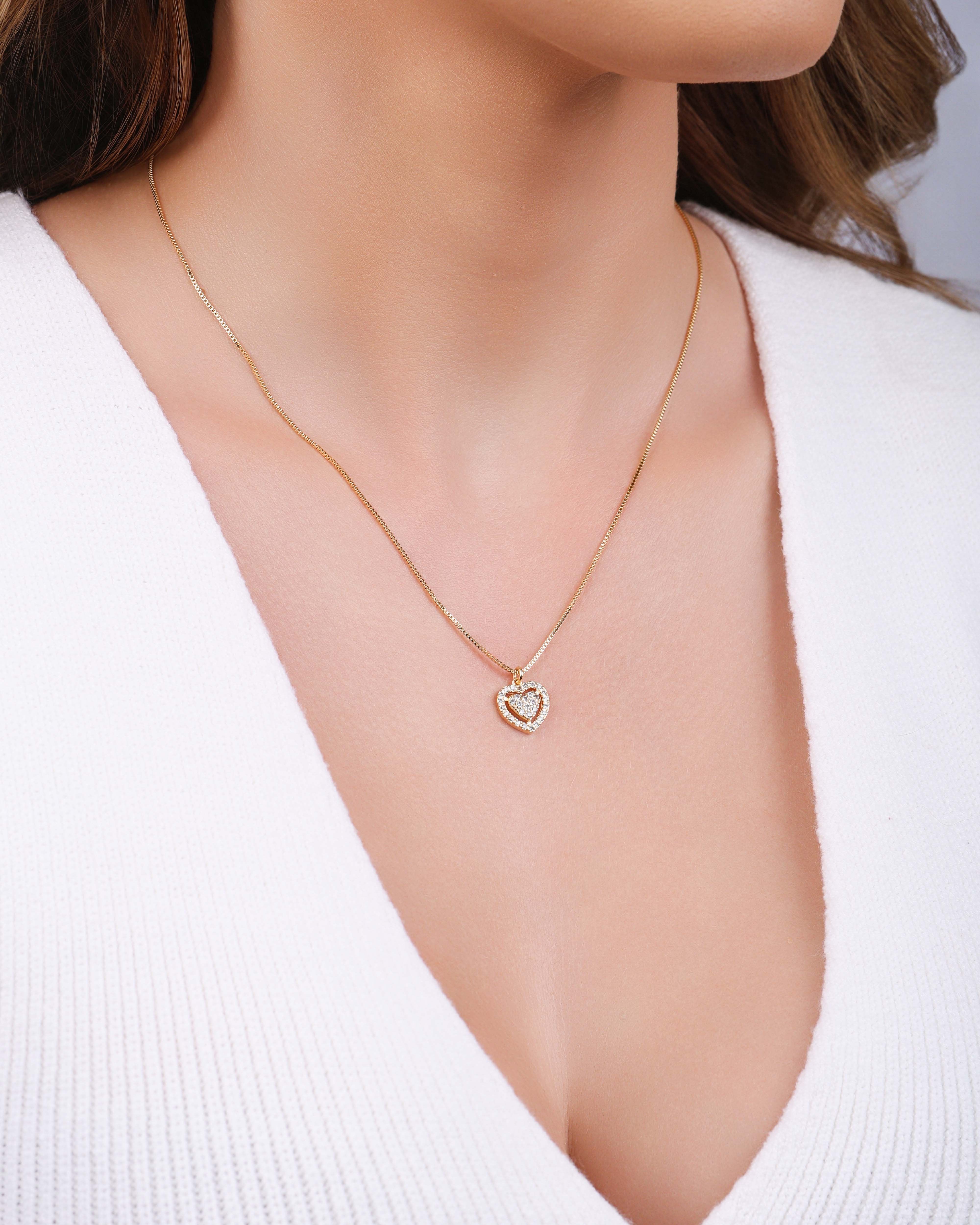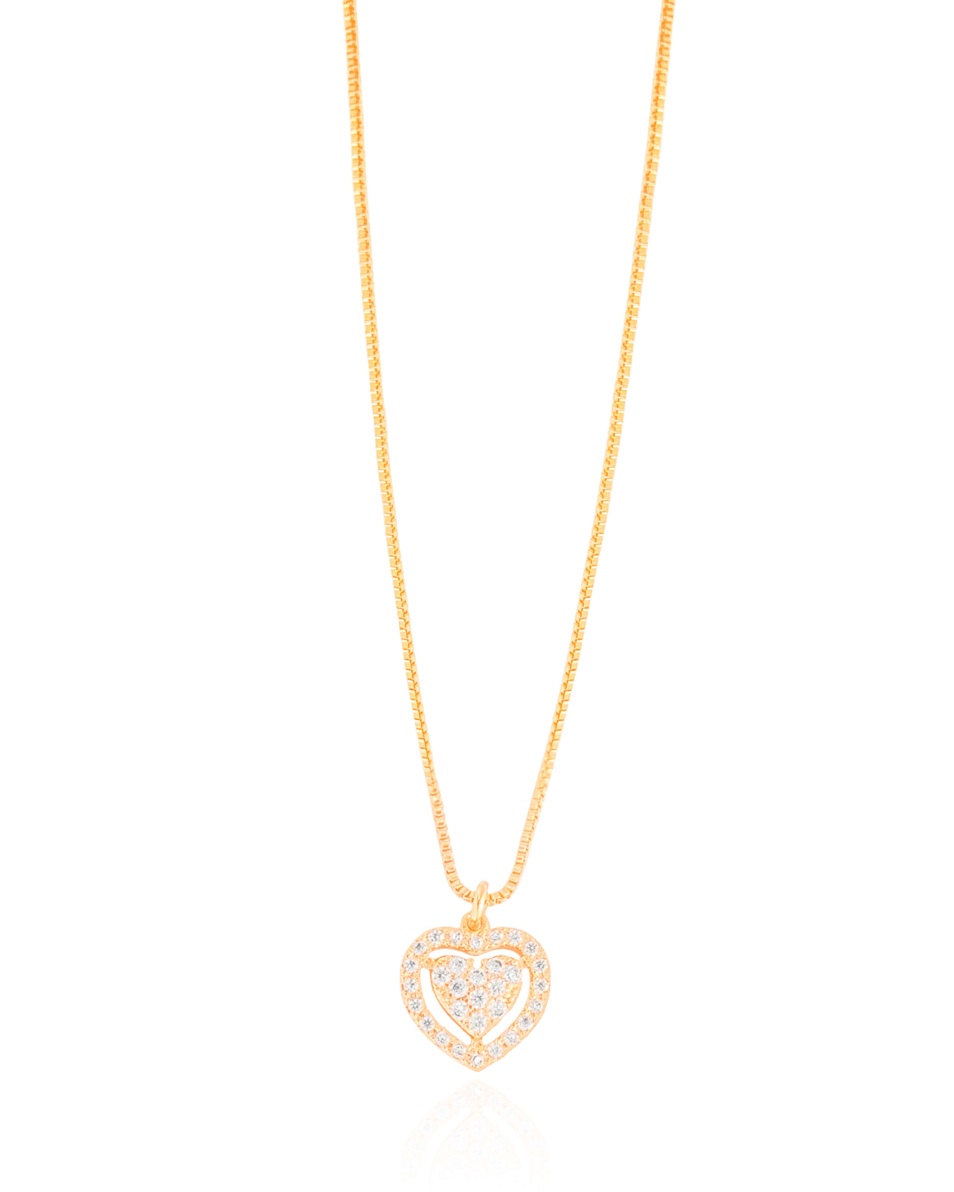 Design: Pingente de coração vazado cravejado com cristais delicados, em corrente veneziana fina e elegante.