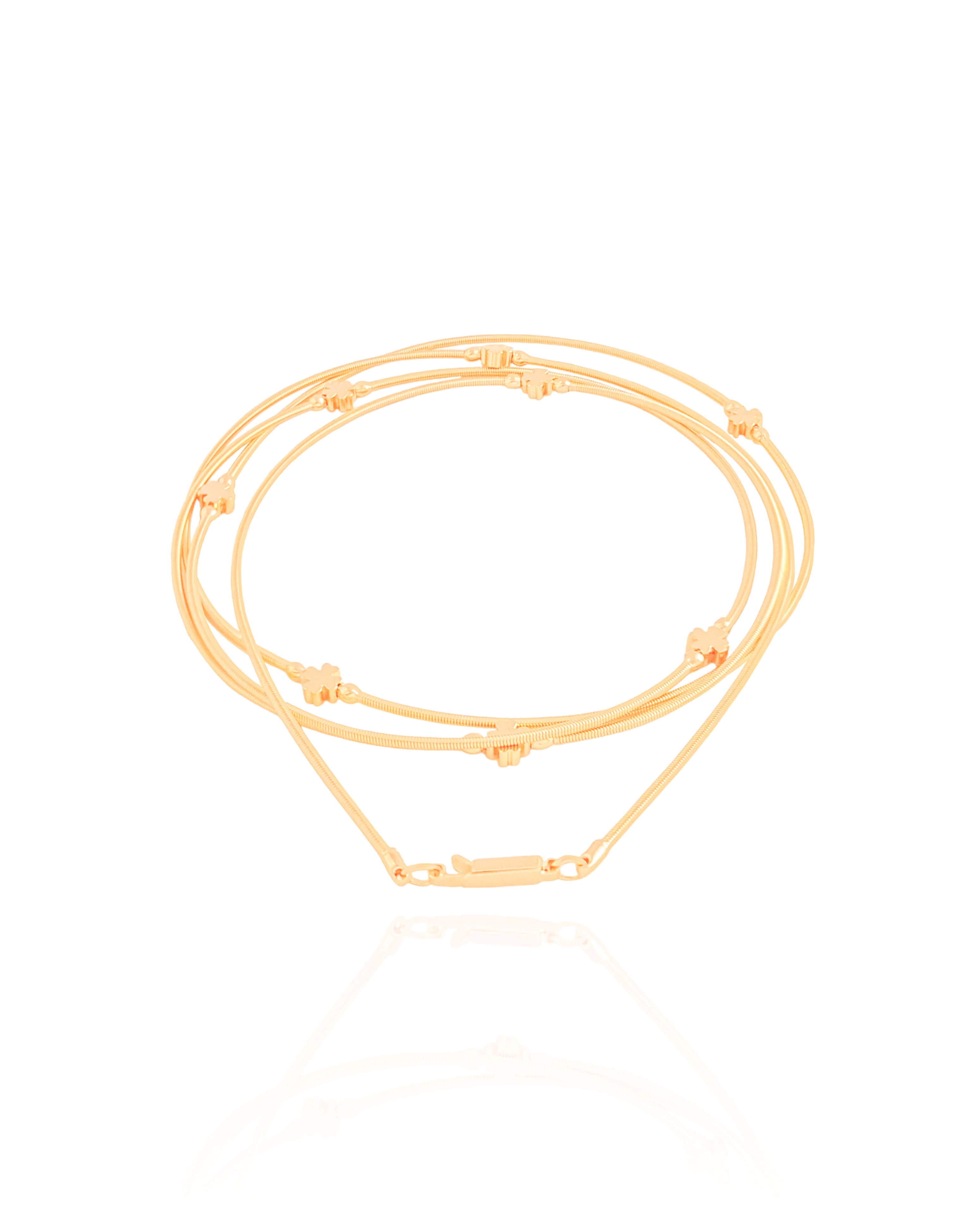 Banhada a ouro 18K, essa pulseira transmite sofisticação atemporal e versatilidade, podendo ser usada sozinha como destaque ou em composições com outras pulseiras. Os trevos acrescentam um toque simbólico e feminino, equilibrando delicadeza, estilo e presença de forma natural.