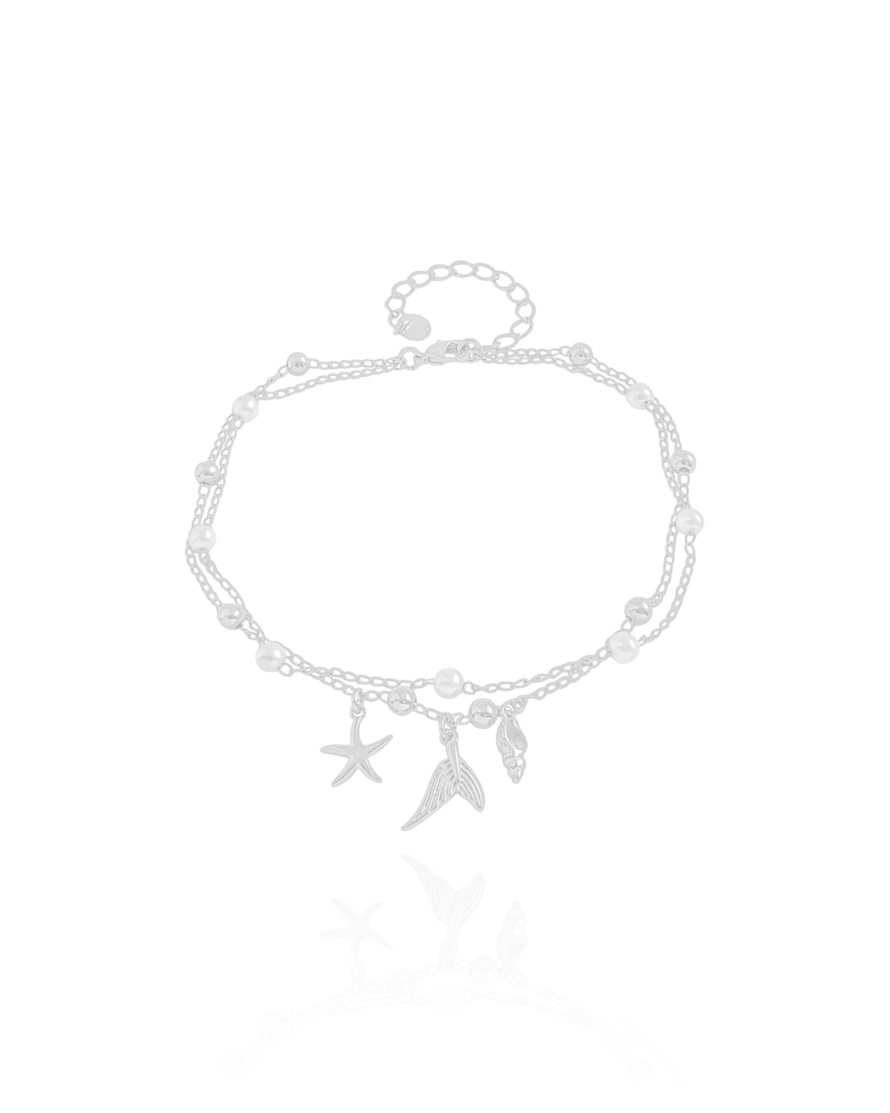 Design: Tornozeleira dupla com correntes finas, bolinhas de 4 mm, pérolas de 4 mm e pingentes com temática do fundo do mar, criando um visual delicado e feminino.