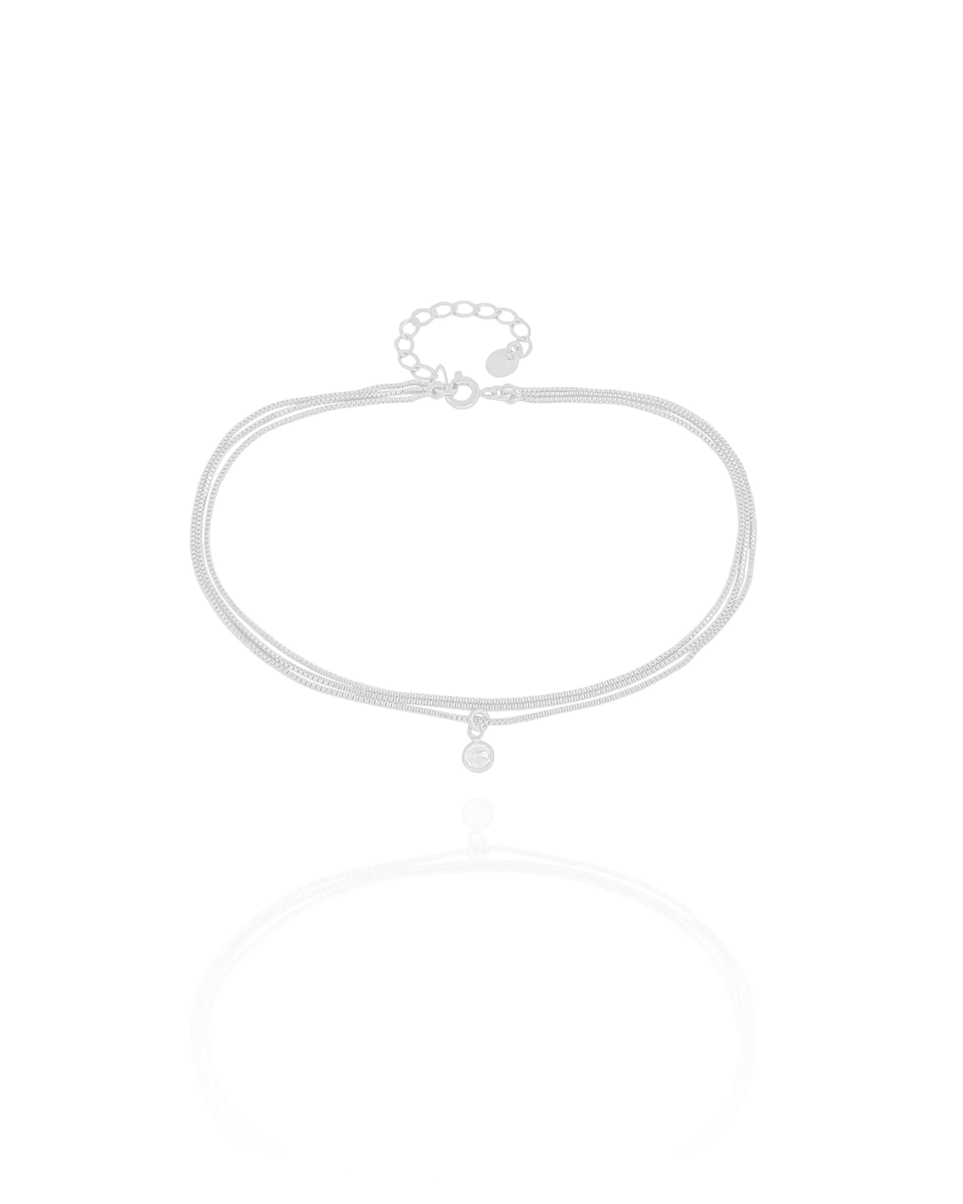 A Tornozeleira Tripla Veneziana Ponto de Luz Cristal em banho ródio branco traz um visual leve e moderno, com três correntes venezianas finas que criam um efeito delicado no tornozelo. O ponto de luz em cristal de 5 mm reflete a luz de forma suave, valorizando o visual com elegância discreta.