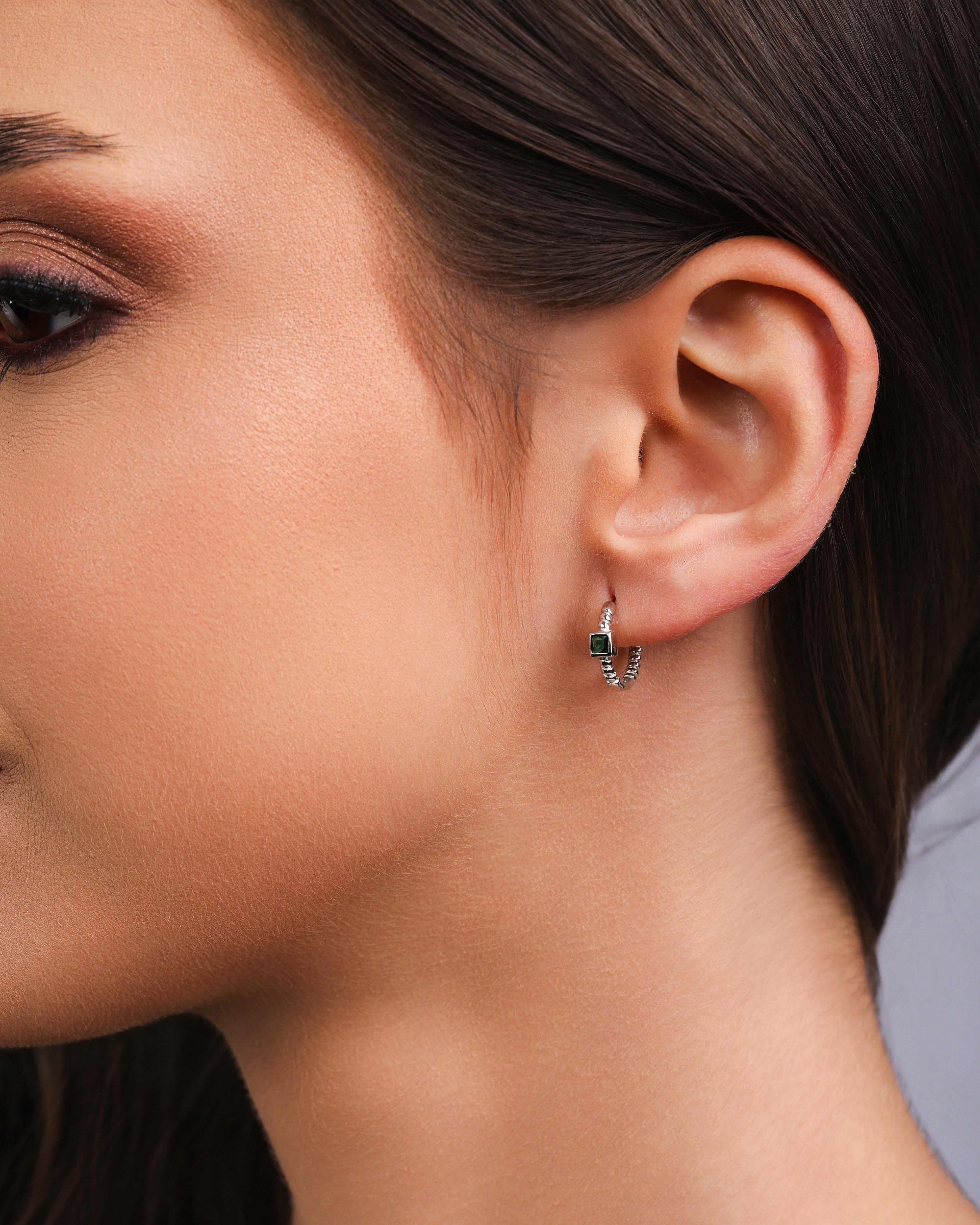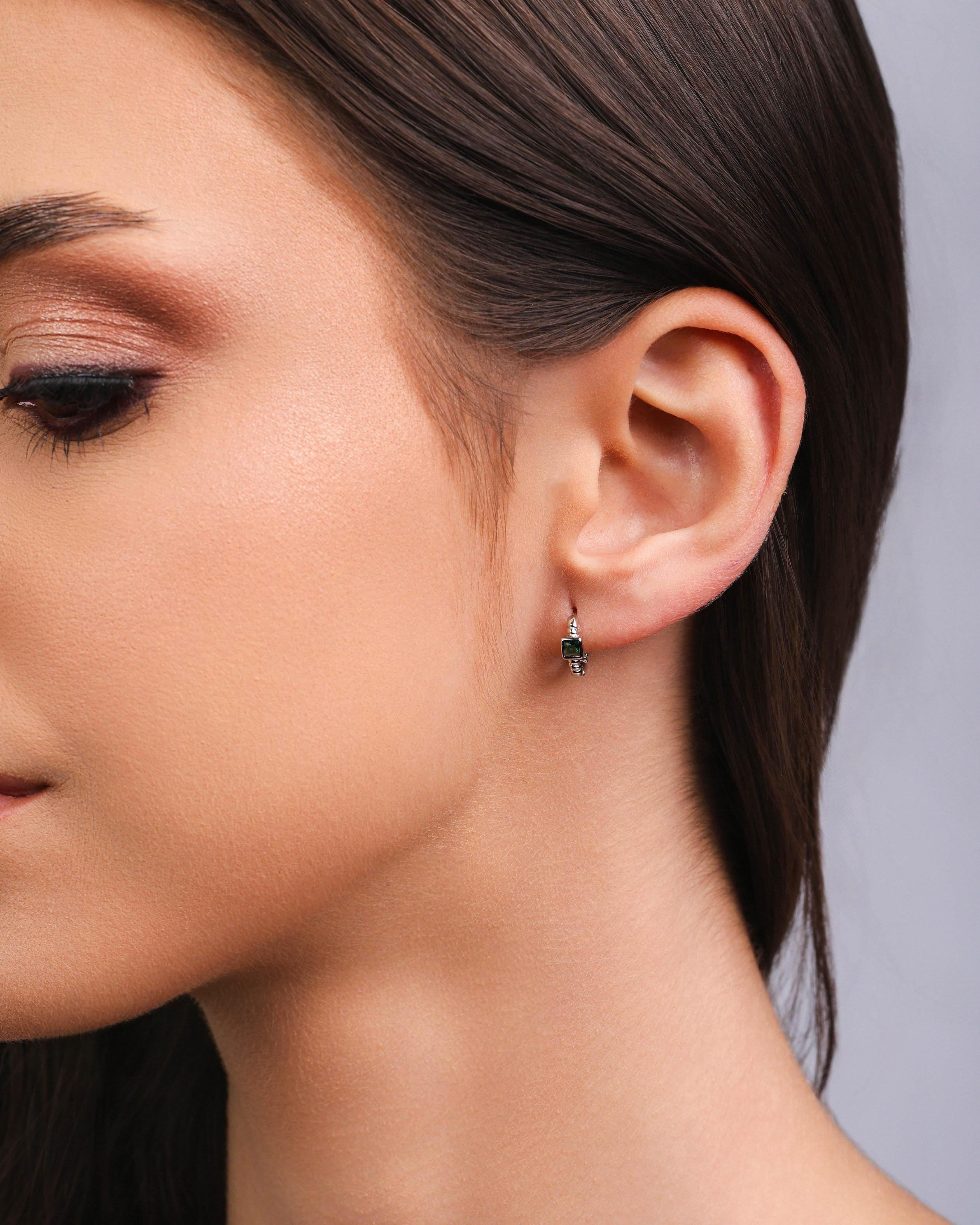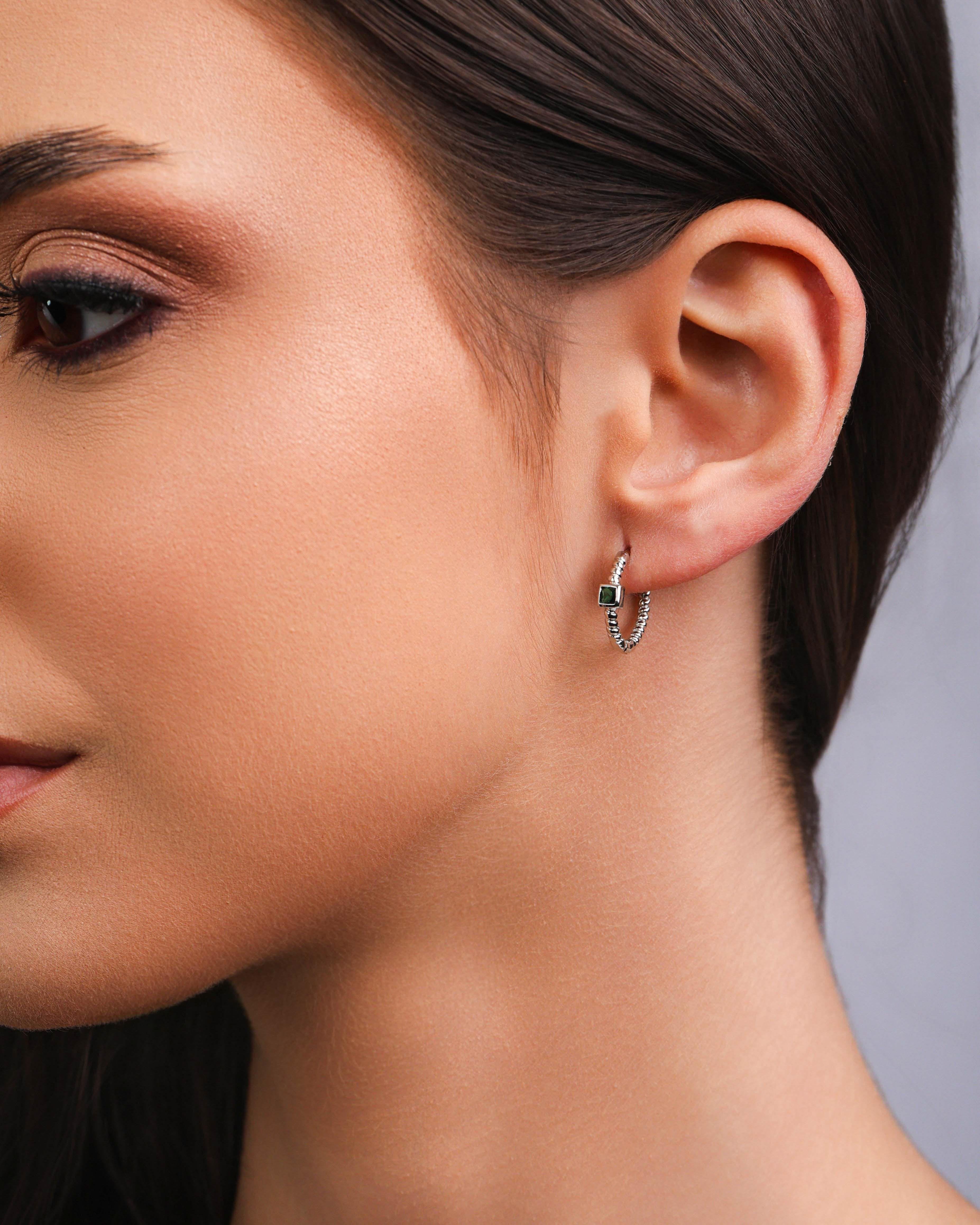 Design: Trio de argolas lisas com ponto de luz quadrado de 3 mm em tom esmeralda, acabamento moderno e delicado.